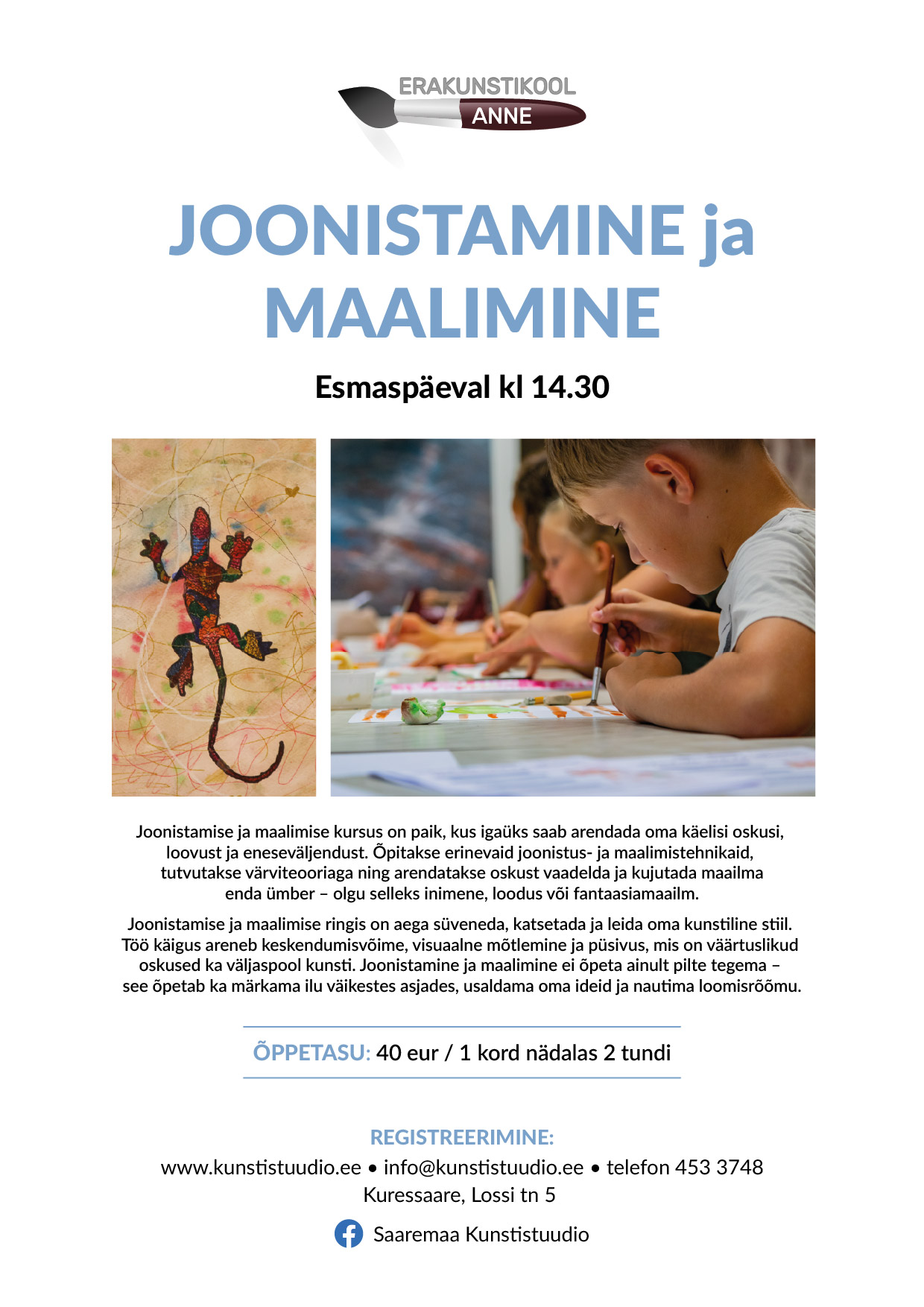 Joonistamise ja maalimise kursusel saab arendada oma käelisi oskusi, loovust ja eneseväljendust. Õpitakse erinevaid joonistus- ja maalimistehnikaid, tutvutakse värviteooriaga ning arendatakse oskust vaadelda ja kujutada maailma enda ümber – olgu selleks inimene, loodus või fantaasiamaailm.