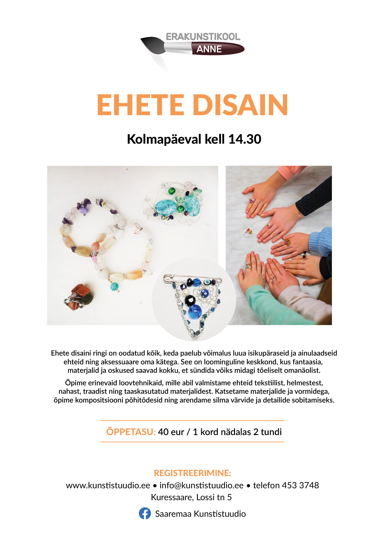 Ehete disaini ringi on oodatud kõik, keda paelub võimalus luua isikupäraseid ja ainulaadseid ehteid ning aksessuaare oma kätega. See on loominguline keskkond, kus fantaasia, materjalid ja oskused saavad kokku, et sündida võiks midagi tõeliselt omanäolist.