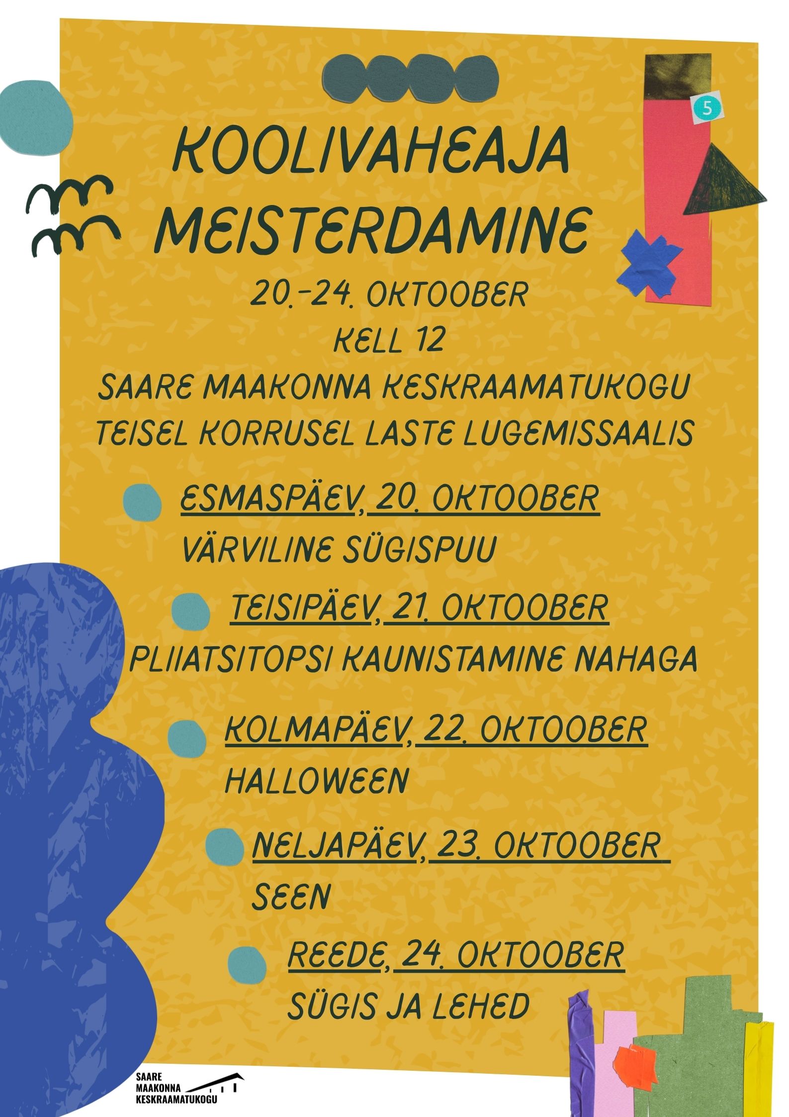 Koolivaheaja meisterdamine 20.-24. oktoober kell 12 Saare Maakonna Keskraamatukogu laste lugemissaalis