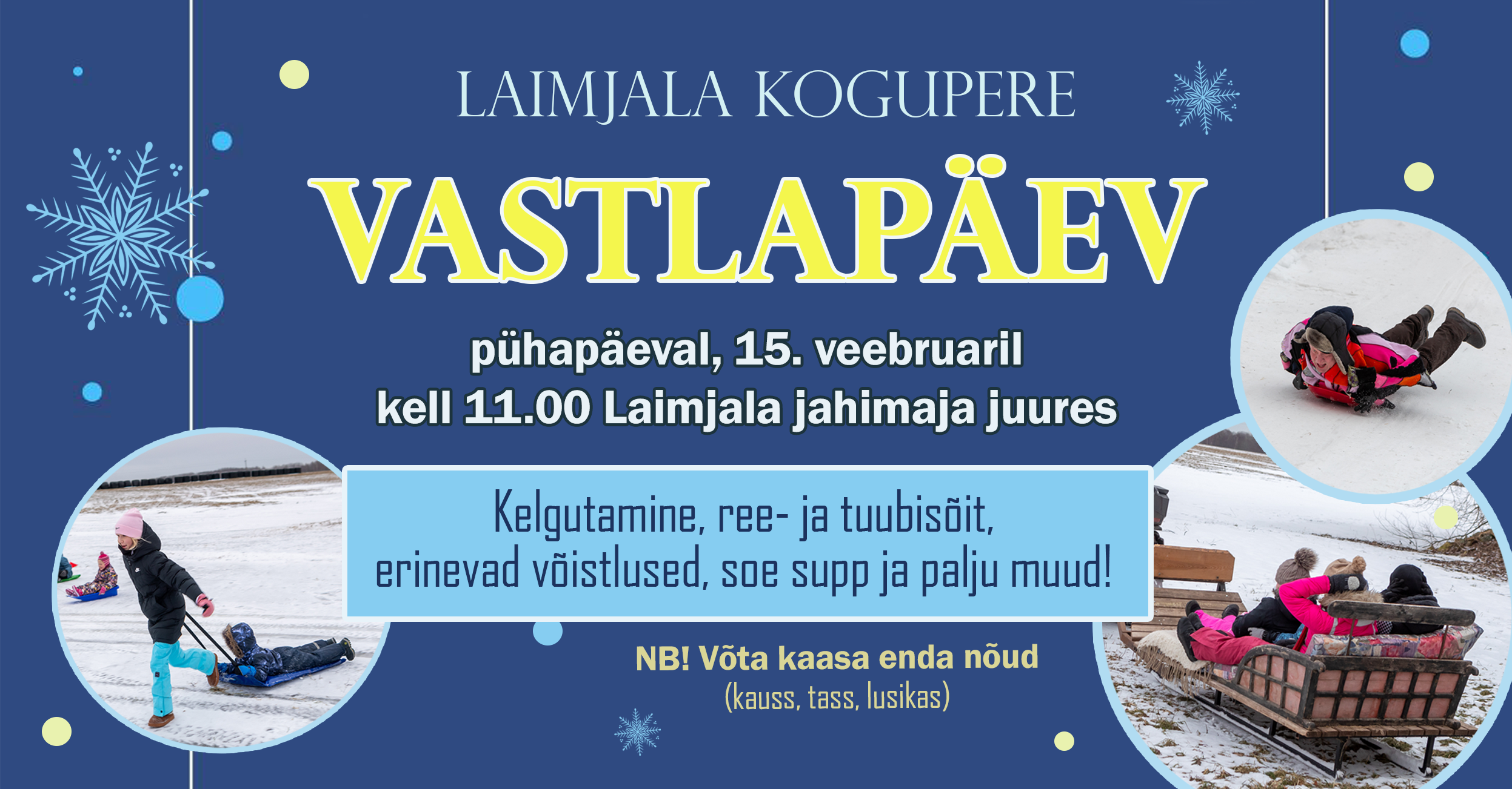 Kohtume Laimjala jahimaja juures kogupere vastlapäeval! Oodata on kelgutamist, ree- ja tuubisõitu, lõbusaid võistlusi, auravat sooja suppi ja seda päris õiget vastlarõõmu, mis paneb põsed punama ja silmad särama. Võta pere, sõbrad ja hea tuju kaasa ning tule õue lustima - kõik on oodatud!