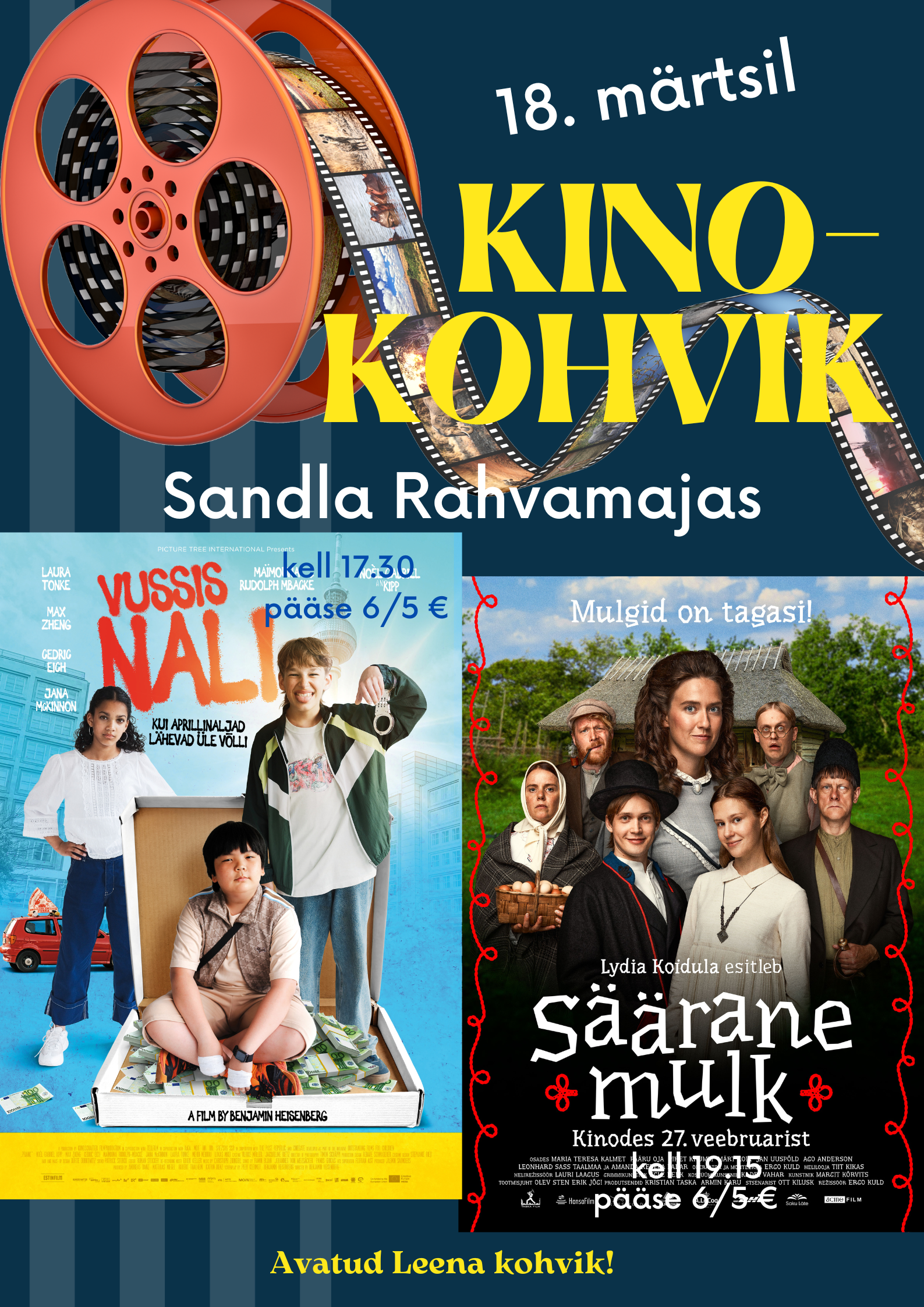 Kinokohviku filmideks "Vussis nali" (lastefilm) ja "Säärale mulk" (kömöödiafilm). Avatud kohvik!